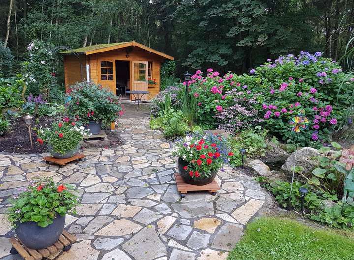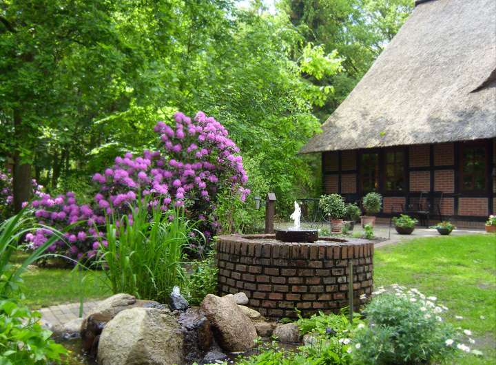 Das Haus liegt im eigenen Wald und wird von einem grossen Garten (überwiegend Rasen und Rhododendronbüsche) und einem Brunnen mit kleinem Teich sowie mehreren Terrassen umgeben. Des Weiteren befinden sich in Hausnähe ein Carport für zwei PKW, Aufsitz-Rasenmäher und Fahrräder, Schafstall, Hühnerstall, Erdkeller (moortypisch), Holzschuppen und ein 16 qm Blockhaus. Alles umgeben von alten Eichen, Fichten, Ahorn, Buchen und Birken. Die idyllische Lage garantiert Entspannung und viele Freizeitmöglichkeiten.
