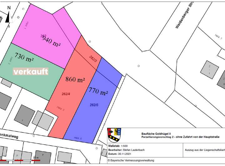 Durch Aufteilung der Flr.-Nr. 262/3 und Vereinigung mit einem entsprechenden Teil dieses Flurstücks kann die Fläche des eigentlichen Flurstücks Nr. 262 erweitert werden.