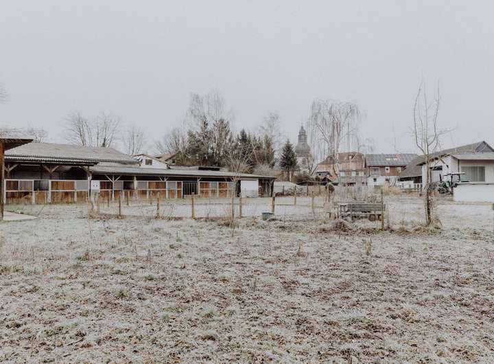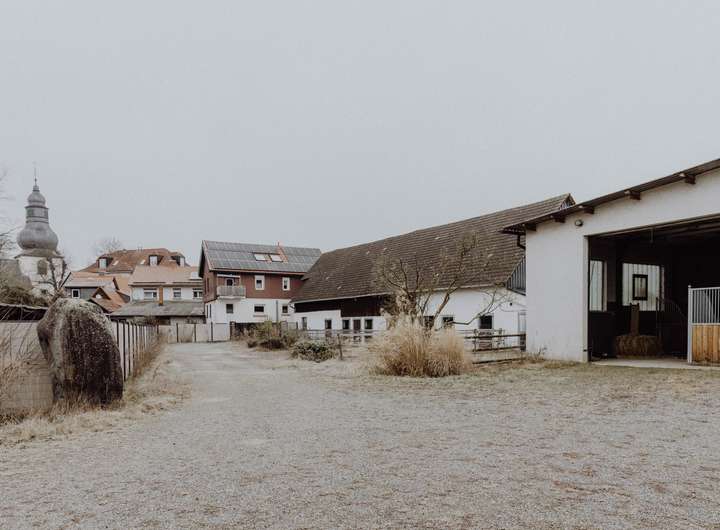 Das Grundstück weist im Moment noch einen stillgelegten Rehastall für Pferde mit Scheune, Stallungen, Hallen, Unterständen und Aufenthaltsraum auf. Die bestehenden Bauten sollten einem Neubau weichen.