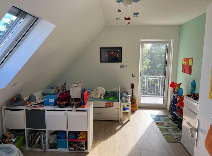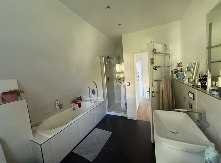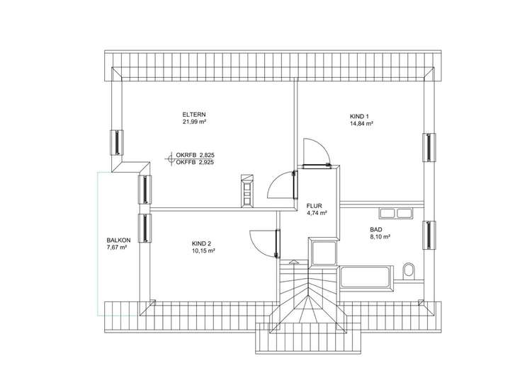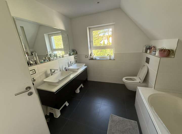 Das Haus verfügt über 150 qm Wohnfläche aufgeteilt auf Erd- und Dachgeschoss. Im EG befinden sich ein großzügiges Wohnzimmer mit Kamin, offener Koch- und Essbereich. Ein Büro, Abstellraum und ein Gäste-Duschbad komplettieren diese Ebene. Im Dachgeschoss sind ein Elternschlafzimmer und zwei lichtdurchflutete Kinderzimmer. Das Tageslichtbad sorgt dafür, dass sowohl die Kinder ihren Spaß in der Badewanne haben und am Doppelwaschbecken schnell die Zähne geputzt sind oder schnell die Dusche genutzt. Im Keller befindet sich ein großer Hobbyraum sowie ein weiterer Lagerraum und die Waschküche.