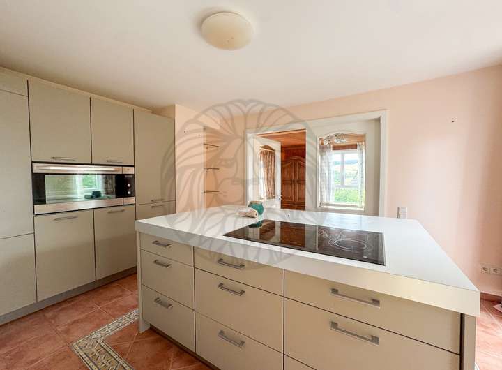 Der Eingangsbereich führt in den großzügigen Wohn- und Essbereich, der durch große, bodentiefe Fenster eine angenehme Atmosphäre schafft. Eine Terrasse, die direkt vor dem Wohnzimmer liegt, lädt zum Verweilen im Freien ein. Die Räume sind insgesamt barrierefrei und funktional gestaltet, eine Renovierung würde den Wohnbereich optisch aufwerten. Rechterhand befindet sich die geräumige Küche, die mit einer Kochinsel sowie zahlreichen Staumöglichkeiten ausgestattet ist – ideal für gemeinsame Kochabende.