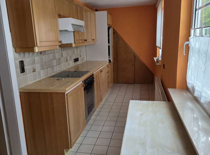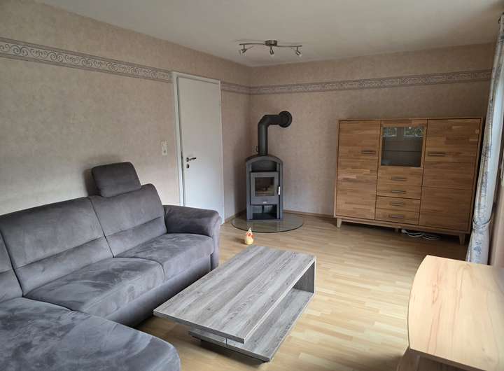 Ergeschoss: Küche und Esszimmer, Flur & Treppenhaus, Wohnzimmer mit Holzofen, Badezimmer mit Dusche und Badewanne, Gäste-WC, Schlafzimmer, Terrasse und Gartenzugang