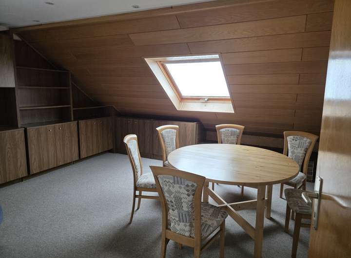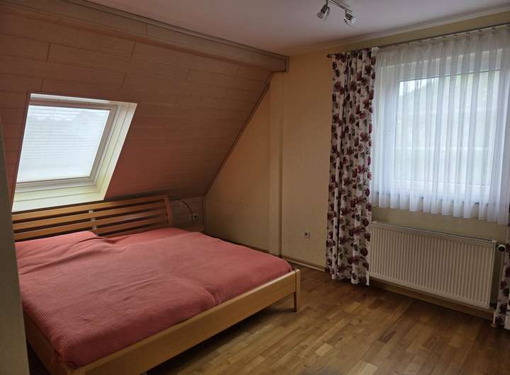 Obergeschoss: Küche, Duschbad, Wohn- und Esszimmer, Schlafzimmer, Balkon mit elektrischer Markise, Speicher