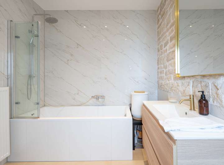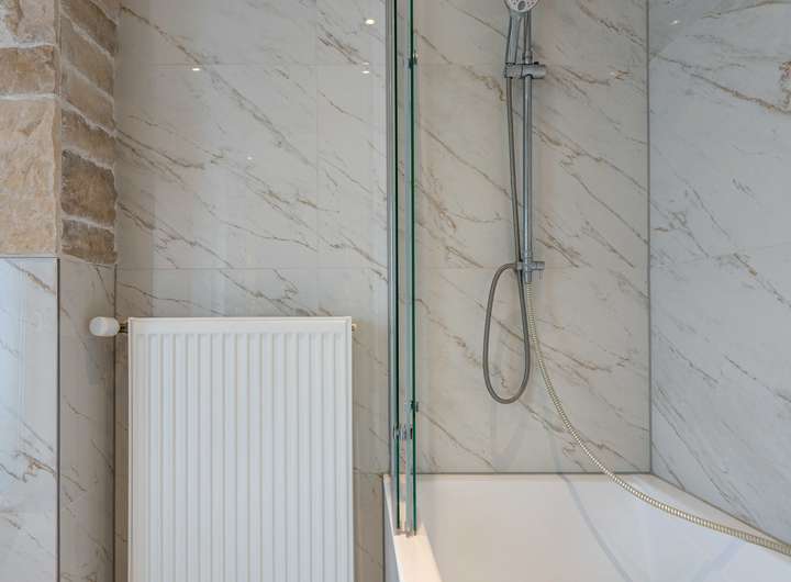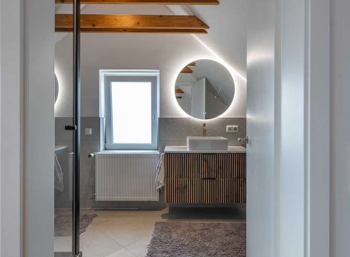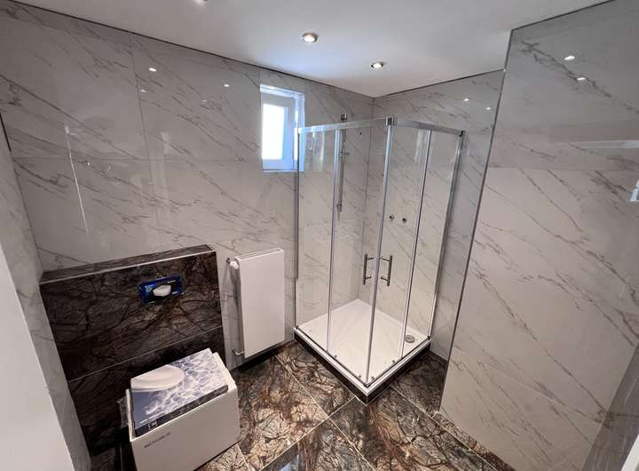 -2 moderne Bäder (Luxusdusche im Elternbad, 1,00 x 1,20 m mit Sitzbank)