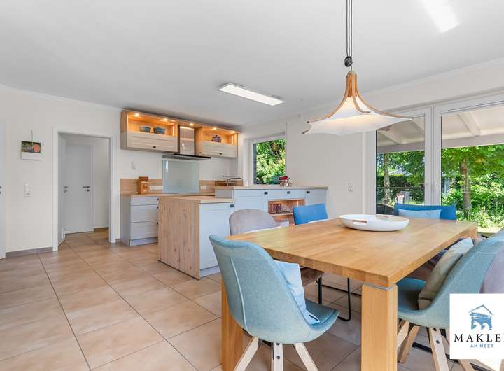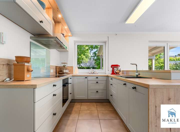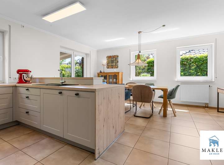 Ausstattung zieht sich wie ein roter Faden durch das gesamte Haus:Weiße Stiltüren, geschmackvoll gewählte Materialien und eine offene, durchdachte Raumaufteilung prägen das Ambiente. Herzstück des Hauses ist der offene Wohn- und Essbereich mit direktem Zugang zur Küche. Diese wurde im Jahr 2021 vollständig erneuert und als elegante Landhausküche in stilvollem Grau gestaltet. Ausgestattet mit einer zentralen Kochinsel, hochwertigen Elektrogeräten, indirekter Beleuchtung und reichlich Stauraum erfüllt sie höchste Ansprüche. Eine große Schiebetür - ebenfalls weiß mit Lichtausschnitt - verbindet die Küche auf harmonische Weise mit dem angrenzenden Wohnzimmer, in dem ein moderner Kaminofen der Marke Lotus für wohlige Wärme sorgt. Vom Essbereich aus gelangt man durch ein großes Fensterelement auf die überdachte Terrasse. Der liebevoll angelegte Garten dahinter bietet mit seinen verschiedenen