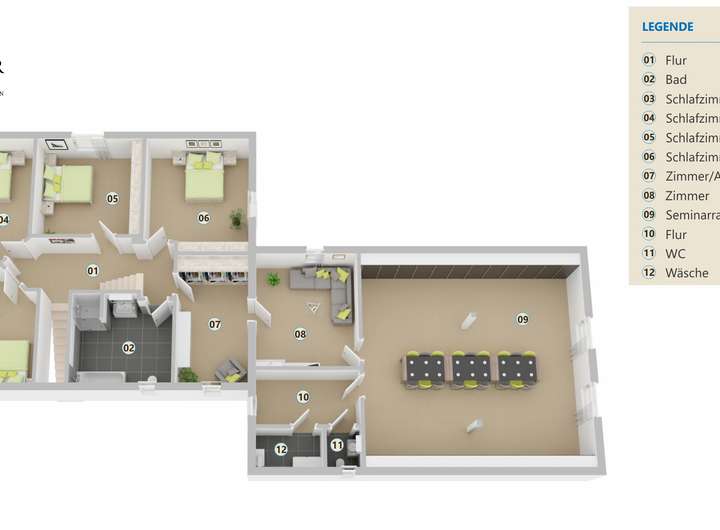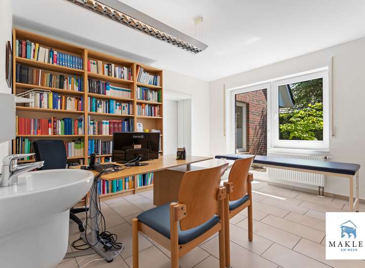 miteinander verbunden - eine seltene Gelegenheit für Familien, Freiberufler oder Investoren mit Weitblick. Vielseitige Nutzungsmöglichkeiten - die ehemalige Arztpraxis Bis Anfang 2025 wurde der separate Gebäudeteil als klassische Hausarztpraxis betrieben. Schon beim Betreten wird deutlich, wie durchdacht und zweckmäßig die Räumlichkeiten gestaltet wurden: Der Empfangsbereich mit Windfang führt direkt in einen großen, lichtdurchfluteten Rezeptionsraum mit angrenzendem Personalzimmer. Die Praxis ist ausgestattet mit einem Wartezimmer, einem Labor sowie drei gut geschnittenen Sprechzimmern - allesamt gefliest in neutralem Weiß und in einem äußerst gepflegten Zustand. Ein besonderes Highlight ist das zusätzlich ausgebaute Dachgeschoss, das über eine Außentreppe separat erschlossen ist. Hier eröffnet sich ein kleiner Flur, von dem aus ein Hauswirtschaftsraum sowie ein weiteres WC mit Handwaschbecken erreichbar sind. Geradeaus betritt man einen großzügigen, offenen Raum, der zuletzt als Therapieraum genutzt wurde. Die Atmosphäre ist ruhig, hell und bietet vielfältige Möglichkeiten. Ein weiteres, kleines Zimmer im Obergeschoss gehört ebenfalls zum Praxisteil. Die Nutzung als klassische Arztpraxis ist selbstverständlich weiterhin denkbar. Alternativ lässt sich dieser Teil auch in zusätzlichen Wohnraum umwandeln, was die Immobilie insbesondere für große Familien oder Mehrgenerationenkonzepte attraktiv macht.