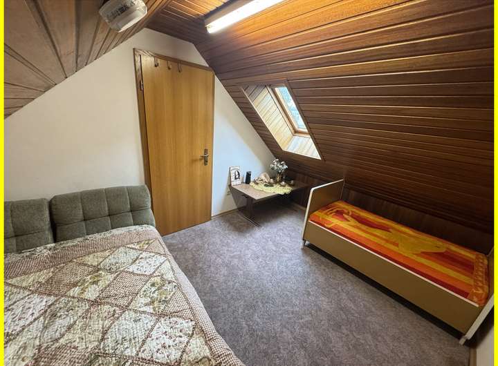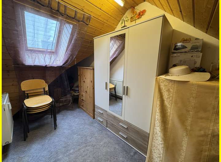 Das Haus erstreckt sich über zwei Etagen: Im Erdgeschoss erwartet Sie ein großzügiger Wohnbereich mit Essplatz sowie eine separate, funktionale Einbauküche. Das Badezimmer ist mit einer Dusche ausgestattet. Im Obergeschoss befindet sich ein großes Schlafzimmer, ein praktisches Durchgangszimmer (ideal als Ankleide nutzbar) sowie ein weiteres, helles Zimmer mit Dachfenstern – bestens geeignet als Kinder-, Gäste- oder Arbeitszimmer.