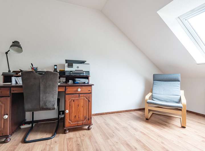 Das ausgebaute Dachgeschoss bietet einen weiteren großzügigen Raum, der sich flexibel nutzen lässt – als Büro, Gästezimmer oder Rückzugsort.
