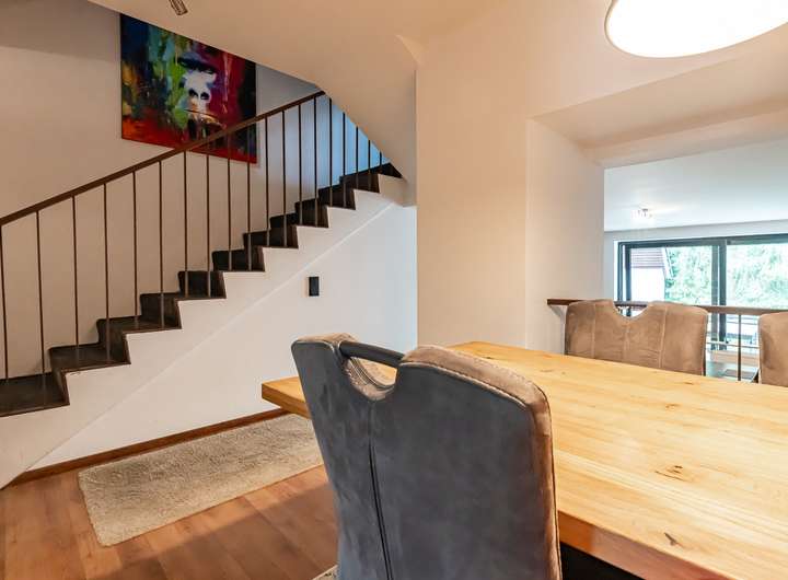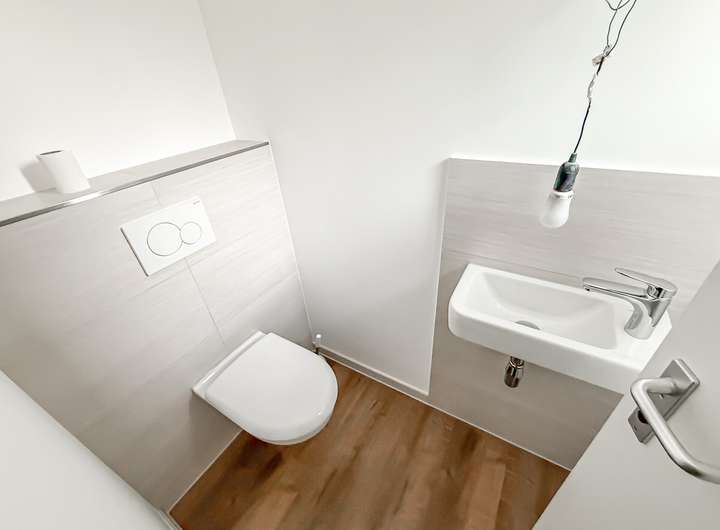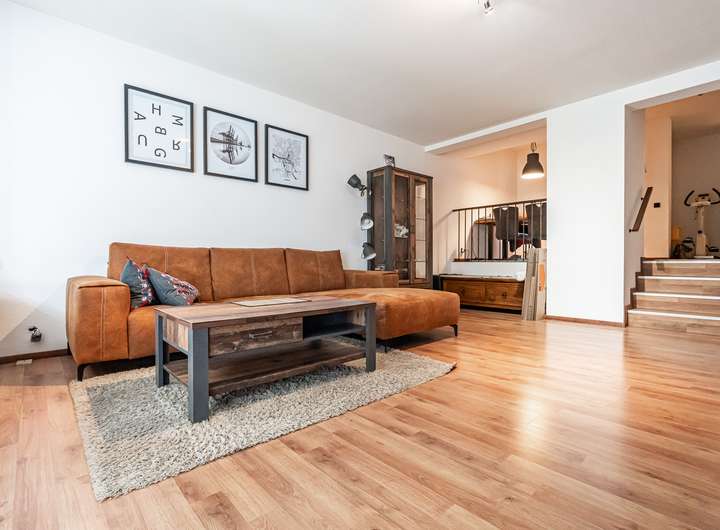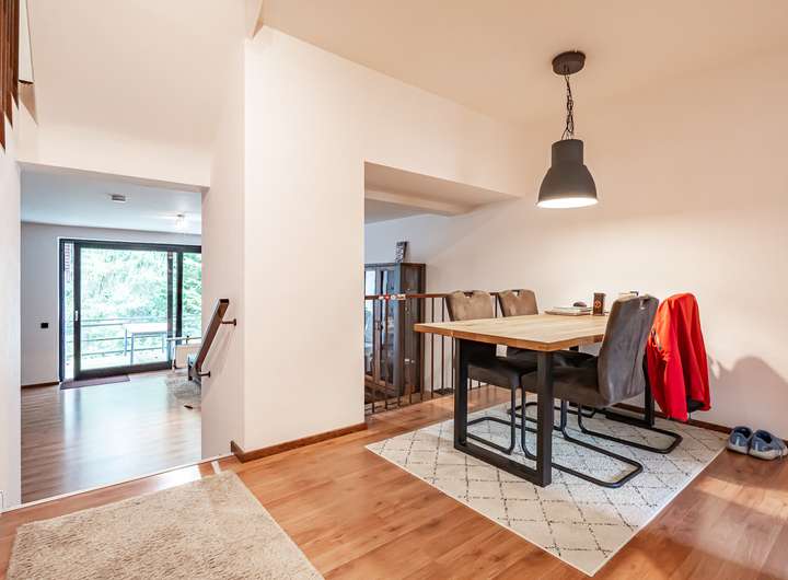 Auf insgesamt ca. 124 m² Wohnfläche verteilt sich ein durchdachter Grundriss mit mehreren Ebenen, der für ein offenes und dennoch klar strukturiertes Raumgefühl sorgt. Das helle Wohnzimmer mit direktem Zugang zur großzügigen Loggia lädt zum Verweilen ein und bietet einen schönen Ausblick ins Grüne. Angrenzend befinden sich eine hochwertige Einbauküche sowie eine offene Essdiele. Ein modernes, komplett saniertes Gäste-WC rundet das Raumangebot auf dieser Ebene ab.