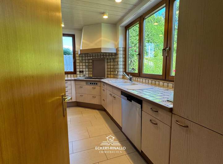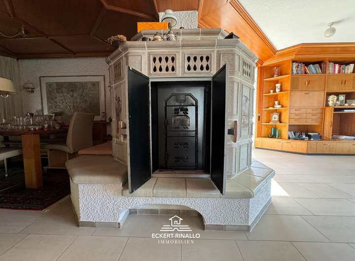 Im Mittelpunkt steht der weitläufige Wohnbereich mit seinem charakteristischen Kachelofen, der Behaglichkeit und ein traditionelles Raumgefühl vermittelt. Die angrenzende Küche ist funktional gegliedert und bietet kurze Wege zum Essbereich sowie Zugang auf die Terrasse. Hochwertige Fliesenböden, solide Innentüren und detailgenaue Handwerksausführung verleihen dem Haus eine wertige Anmutung, die bis heute erhalten geblieben ist.