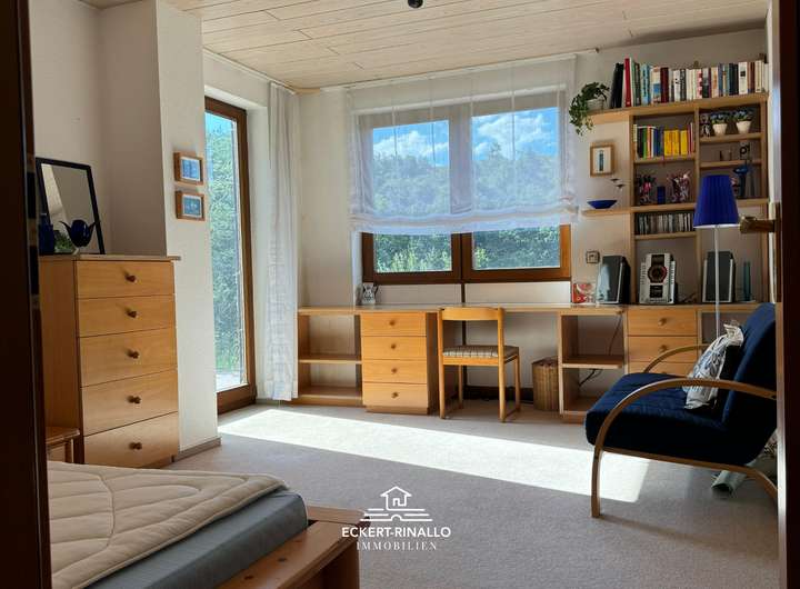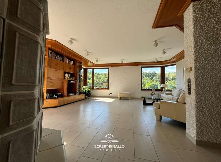 Das Herzstück des Hauses bildet der weitläufige Wohn- und Essbereich. Bodentiefe Fenster durchfluten den Raum mit Licht und öffnen den Blick sowohl in den gepflegten, nicht einsehbaren Garten als auch auf den gegenüberliegenden Wald – eine reizvolle Kombination aus Geborgenheit und Naturverbundenheit. Die offene Verbindung von Innen- und Außenraum schafft eine wohnliche und zugleich repräsentative Atmosphäre, die zum Verweilen einlädt.