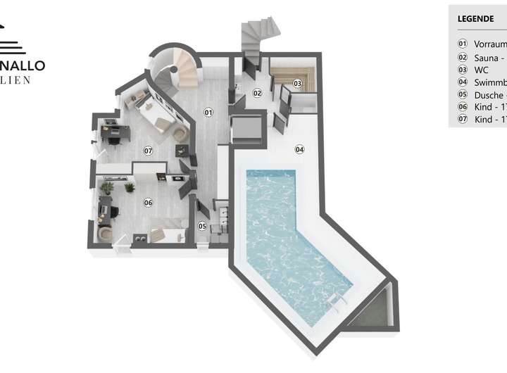 Auf der Wohnebene unter dem Wohn-Essbereich liegen mehrere Kinder- und Jugendzimmer mit eigenem Bad und Aufenthaltsflächen – ein idealer Ort zum Spielen, Lernen und Entspannen. Hier schließt sich auch der großzügige Wellnessbereich mit beheiztem Schwimmbad und Sauna an, der den Wohnkomfort um eine wertvolle Dimension erweitert.