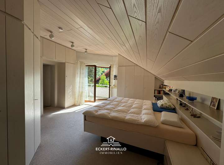 Eine Ebene darüber befindet sich der private Rückzugsbereich mit einem großzügigen Schlafzimmer, angrenzendem Bad, Ankleidemöglichkeit und einem zusätzlichen Raum, der sich ideal als Arbeits- oder Gästezimmer eignet.