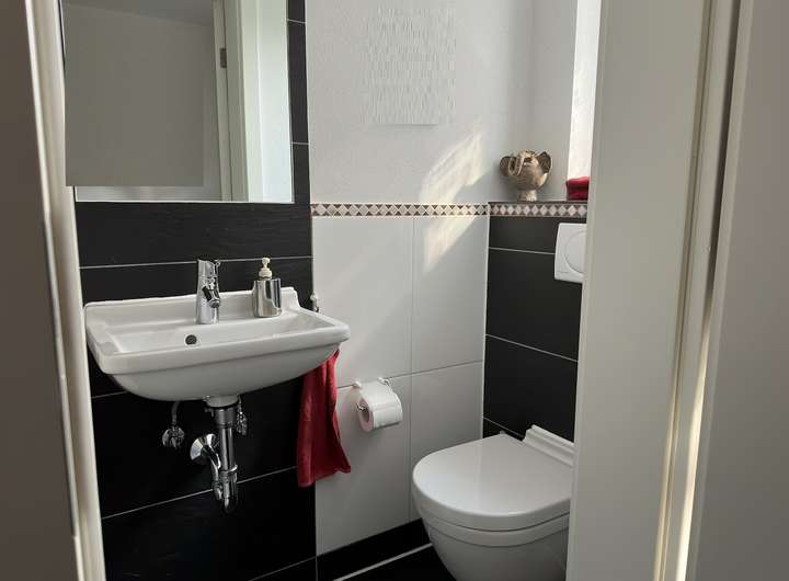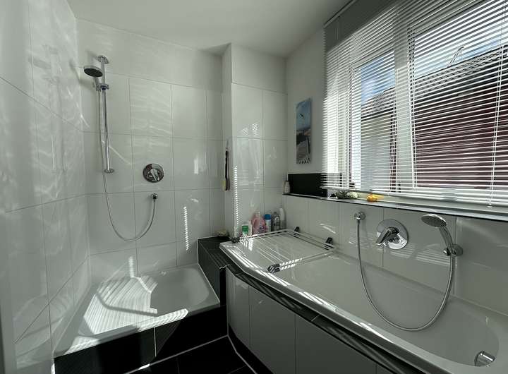 1.Obergeschoss: Flur und beide Schlafzimmer mit Echtholzparkett Buche im englischen Verbund. Bad mit Feinsteinzeug, Boden Dekor Schiefergrau, Wandfliesen weiß.
