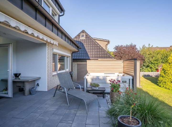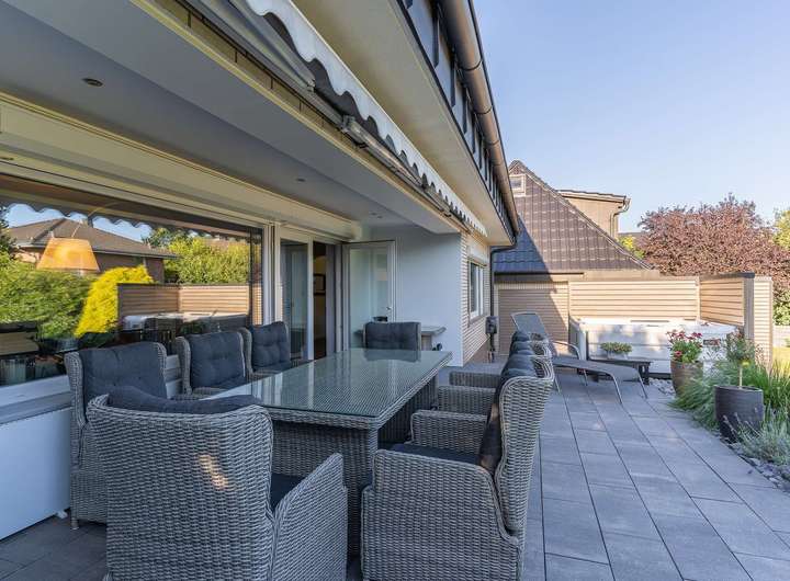 - Sonnenterrasse (ca. 35 m²) mit beheiztem Whirlpool, ganztägiger Besonnung und einer elektrisch ausfahrbaren Markise