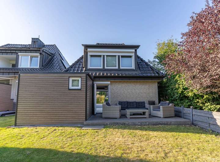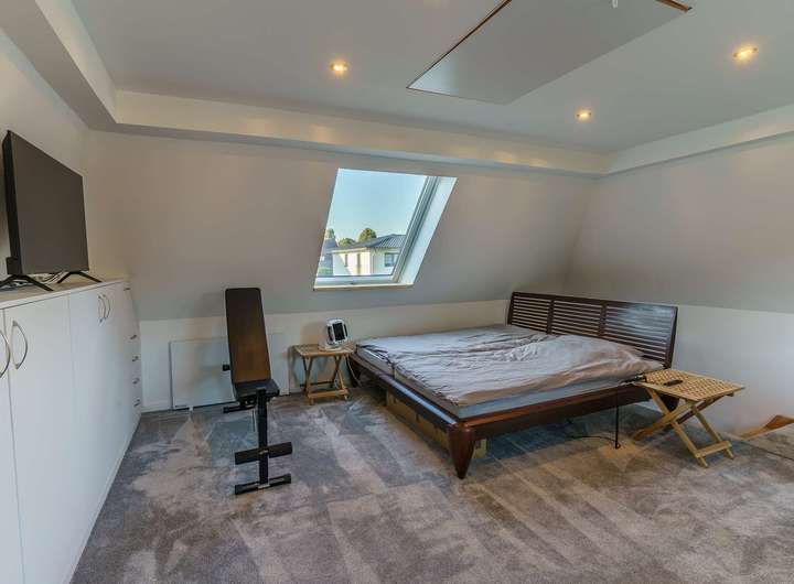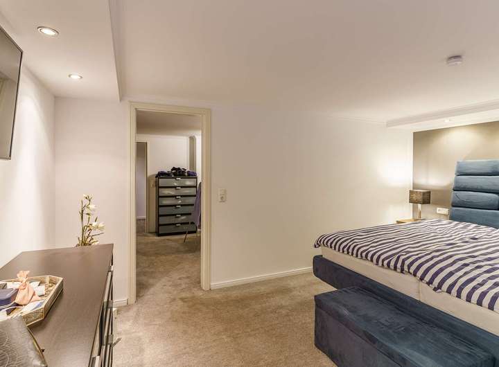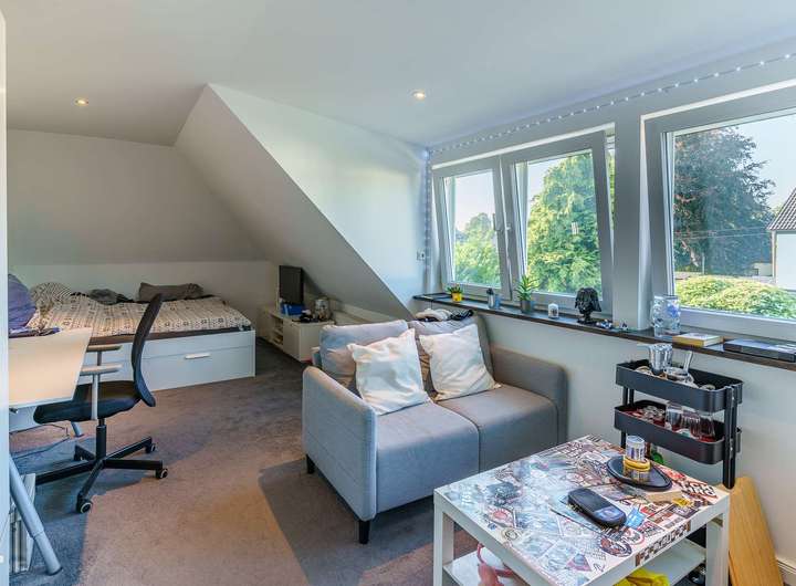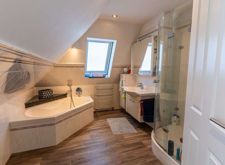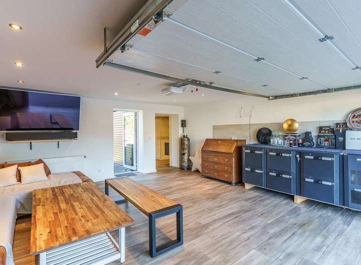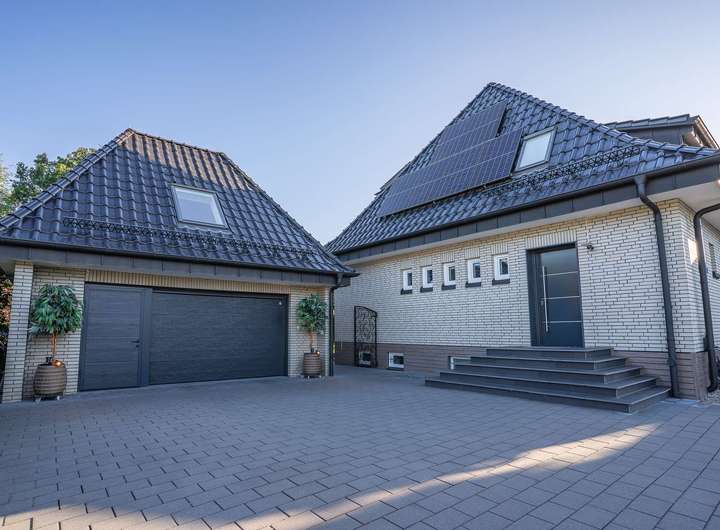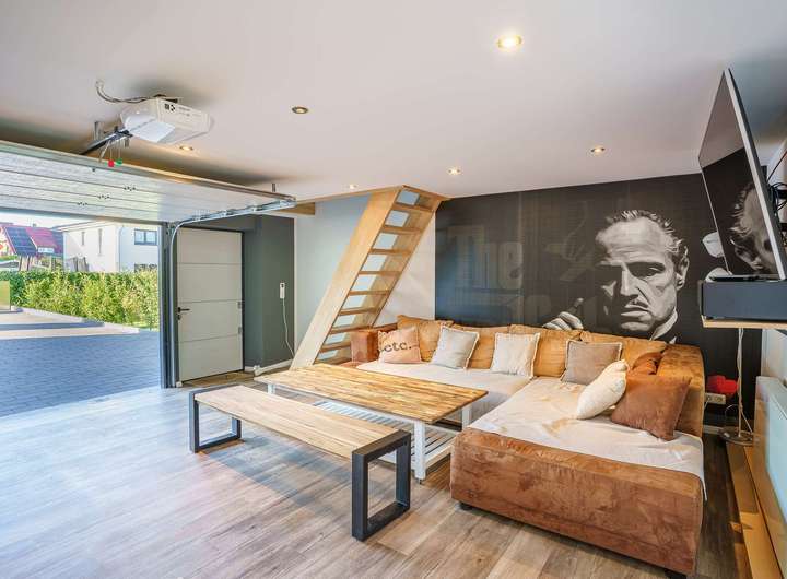 - Besonderes Extra: Wohnlich ausgebaute Garage mit separatem Zugang, ausgestattet mit Wohnzimmer, Bar, Bad und Schlafzimmer im Obergeschoss – ideal als Gästebereich oder für heranwachsende Kinder