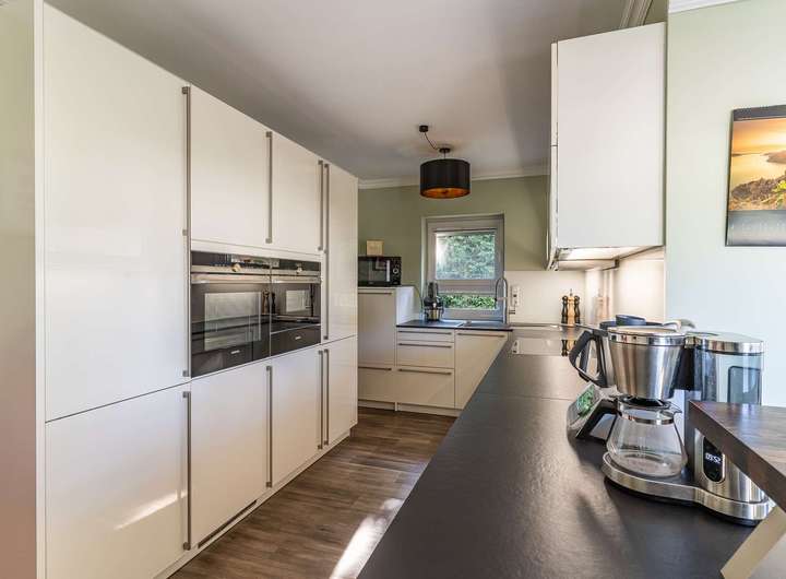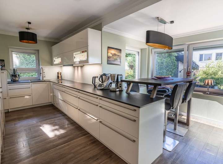 - Hochwertige, weiße Hochglanz-Einbauküche – ideal für gesellige Kochabende mit Familie und Freunden