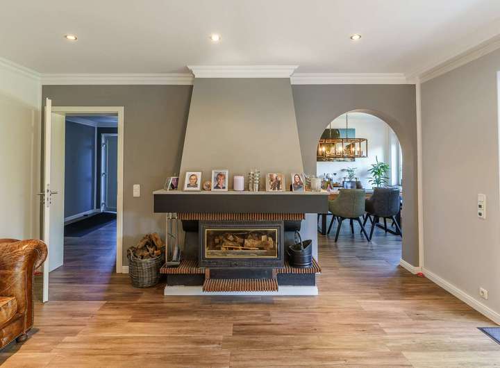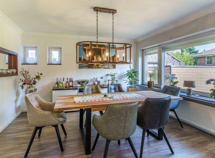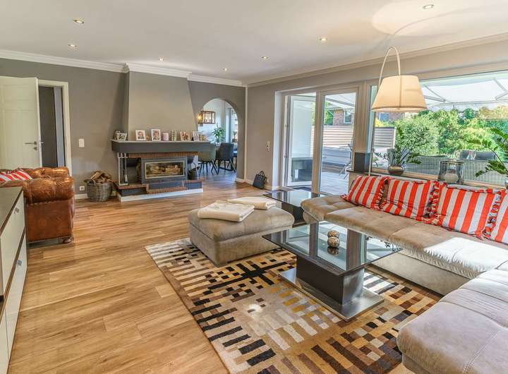 - Großzügiger, lichtdurchfluteter Wohn- und Essbereich mit offenem Grundriss, großen Fensterfronten und traumhaftem Blick in den liebevoll gestalteten Garten