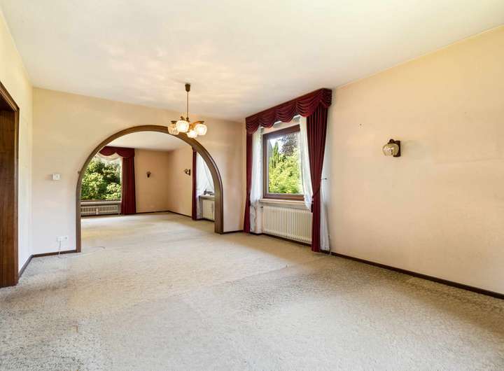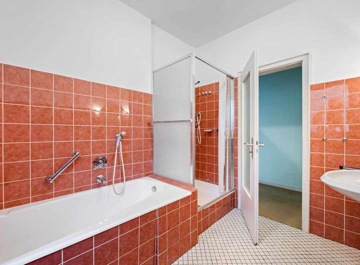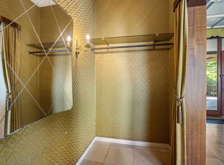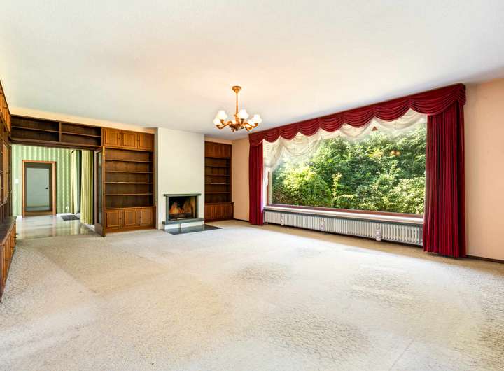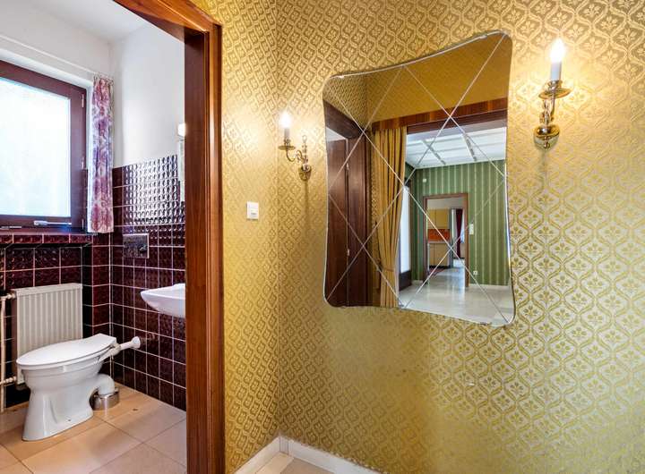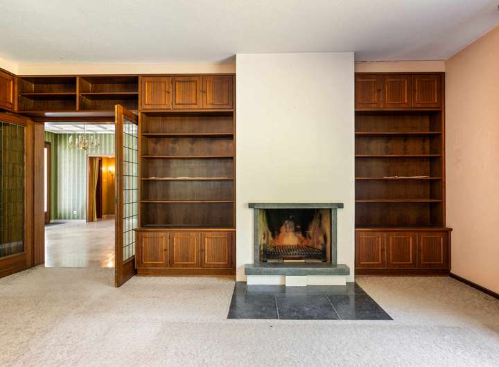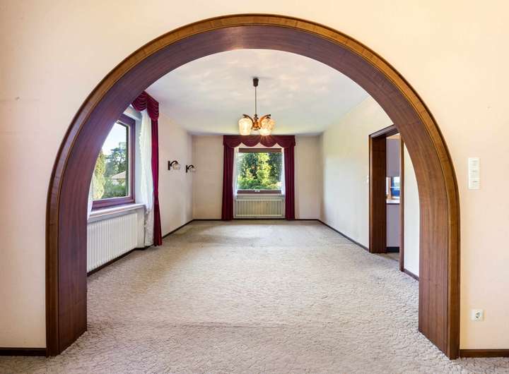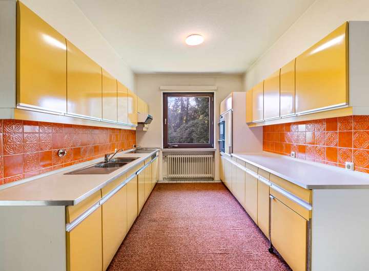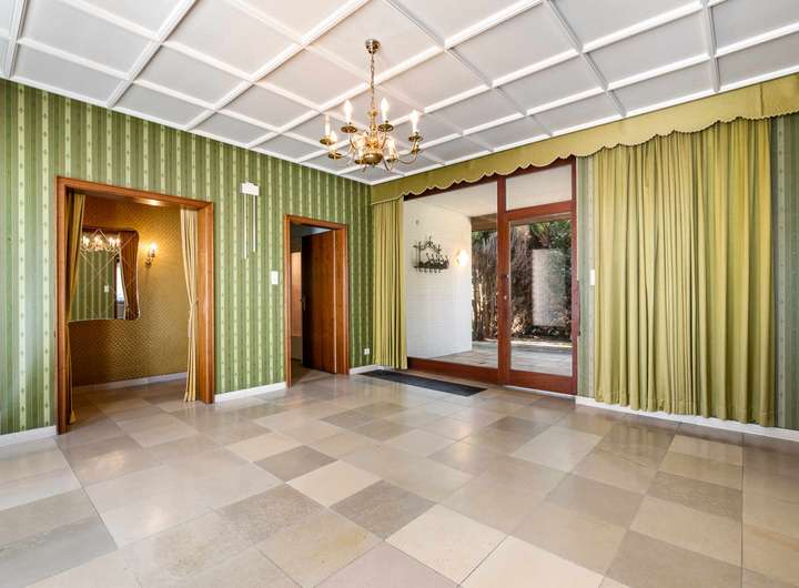 Die Raumaufteilung ist funktional und klar gegliedert: Zwei Tageslichtbäder, davon ein separates Gäste-WC, mehrere helle Zimmer, ein praktischer Flur mit Einbauschränken sowie eine gepflegte Einbauküche im Retro-Stil bieten viel Potenzial zur individuellen Gestaltung. Holzvertäfelungen, Einbaumobiliar und große Fensterflächen prägen den wohnlichen Charakter und vermitteln nostalgischen Charme mit Substanz.