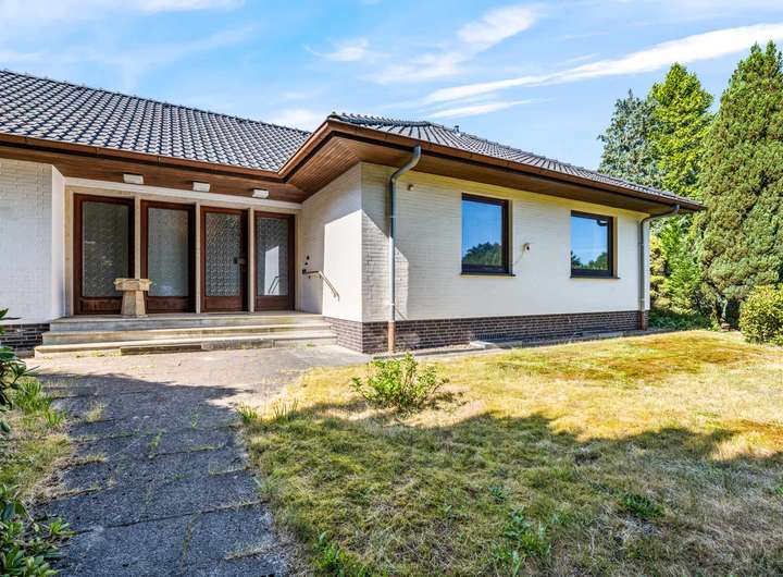 In ruhiger Lage von Stuhr-Fahrenhorst erwartet Sie dieser gepflegte Walmdach-Bungalow mit ca. 154 m² Wohnfläche, Teilunterkellerung, Garage und sonnigem Garten. Das Haus überzeugt durch seine zeitlose Architektur, massive Bauweise und viele liebevoll erhaltene Originalelemente der 1970er-Jahre.