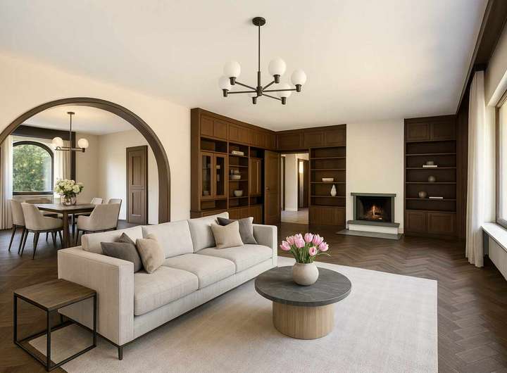 Herzstück ist das ca. 45 m² große Wohnzimmer mit offenem Kamin, breiter Fensterfront und Zugang zur überdachten Terrasse mit zweitem, gemauertem Außenkamin – ideal für gemütliche Stunden im Freien zu jeder Jahreszeit. Ein besonderer Blickfang sind die klassischen Rundbogen-Durchgänge, die Wohn- und Essbereich auf elegante Weise miteinander verbinden und ein offenes, fließendes Raumgefühl schaffen.