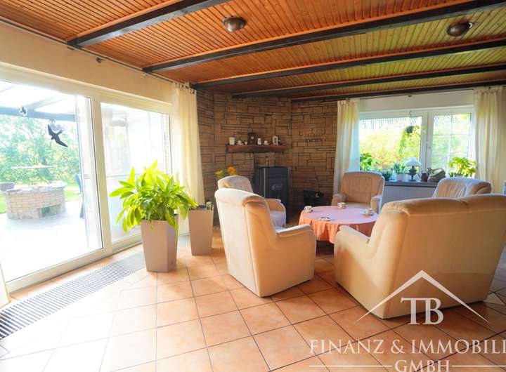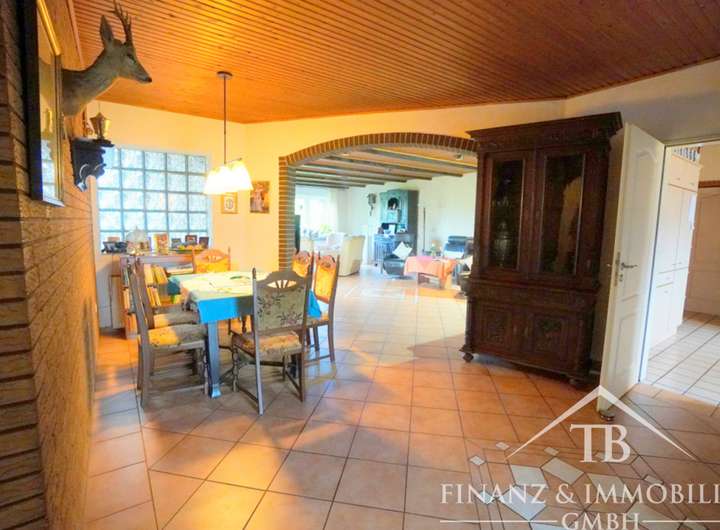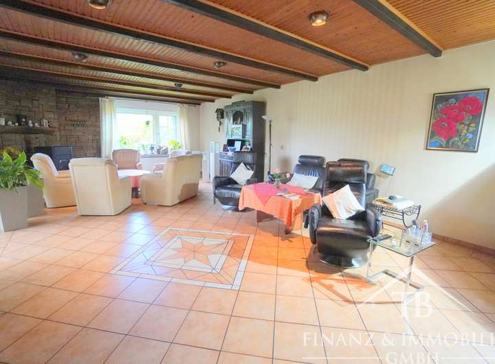 Bereits beim Betreten des Hauses spürt man die angenehme Atmosphäre. Der großzügige, offene Wohn- und Essbereich mit seinen bodentiefen Fensterflächen schafft ein helles, freundliches Ambiente und verbindet Innen- und Außenraum auf harmonische Weise. Vom Wohnzimmer aus genießen Sie den herrlichen Blick auf die überdachte Terrasse, den idyllischen Gartenteich und die angrenzenden freien Wiesen – ein Ort zum Entspannen, Abschalten und Genießen.