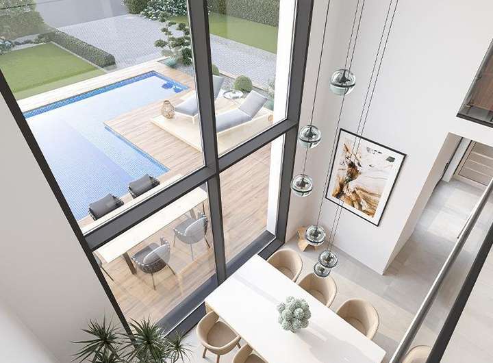 Die Stadtvilla selbst besticht durch ihren einzigartigen Bauhausstil, der klare Linien und funktionale Eleganz vereint. Die großzügigen Fensterfronten sorgen für lichtdurchflutete Räume und einen direkten Blick ins Grüne, während die moderne Architektur harmonisch in die Umgebung integriert ist.