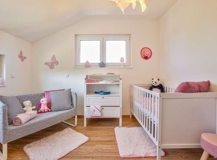 Im Obergeschoss befinden sich mit je 16 m² zwei gleich große Kinderzimmer. Der Elternbereich bietet den Komfort einer Ankleide. Im Obergeschoss ist ein Raum vorgesehen, der als Hauswirtschafts-/Lagerraum verwendet werden kann. Ein großes Familienbad und ein Flurbereich vervollständigen das Raumangebot im Obergeschoss.