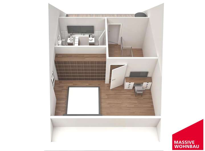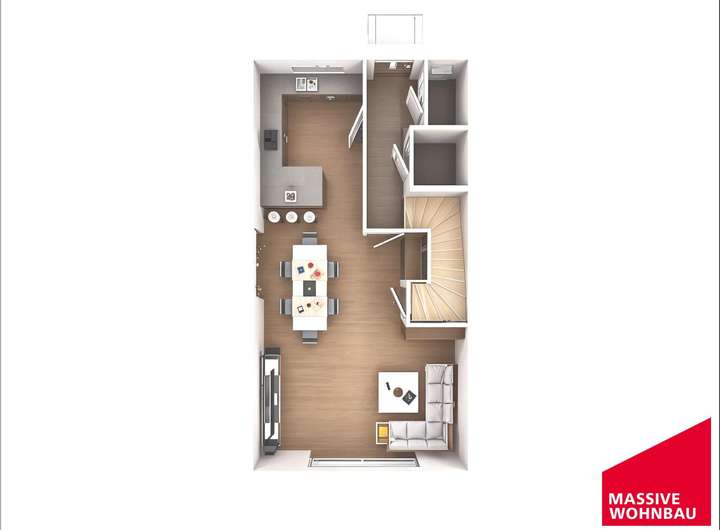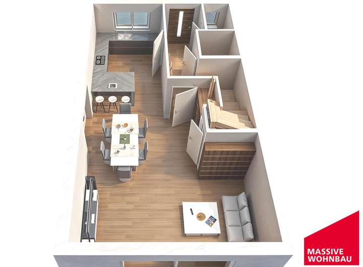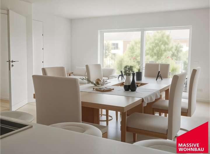 In Erdgeschoß befindet sich der helle großzügige Küche - Wohn- Essbereich mit großem Panoramafenster in den heimeligen Garten. Ein Abstellraum und eine Garderobe bieten Platz für Dinge des tägliche Lebens. Vom Wohn- Essbereich aus haben Sie einen guten Blick in den eigenen Garten. Ein Gäste WC erschließt sich neben dem Eingangsbereich.