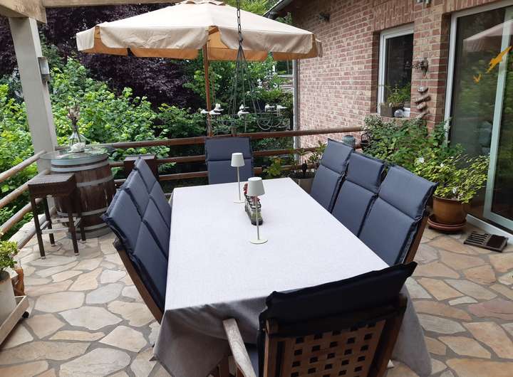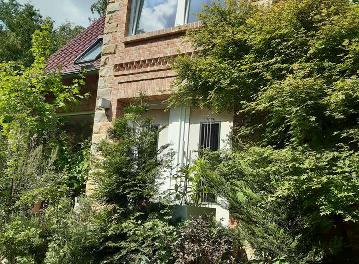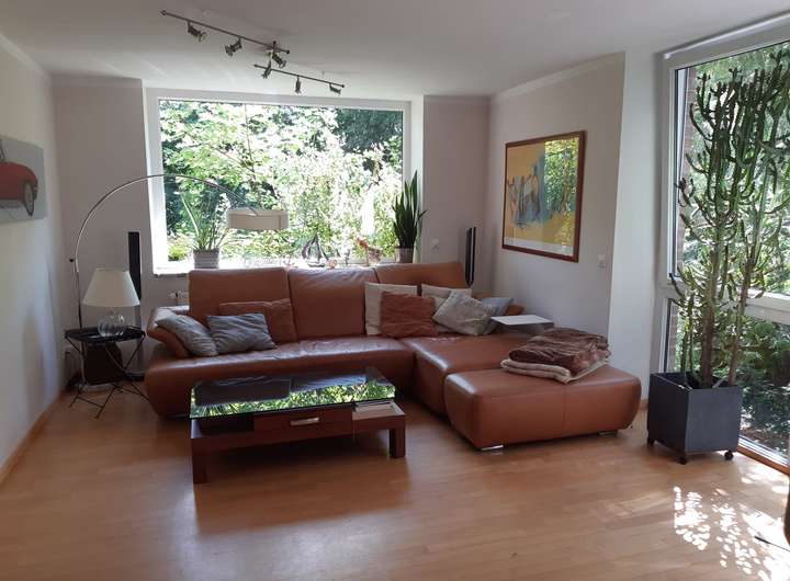Das Erdgeschoss besticht durch seinen großen Wohn-Essbereich (ca. 45 qm) mit bodentiefen Fenstern, Kamin und direktem Ausgang zur höher liegenden Terrasse von gut 30 qm, auf der Sie dank der Glasüberdachung auch bei regnerischem Wetter den Garten genießen und mit Freunden gemütlich zusammensitzen können. Über eine kleine Steintreppe gelangen Sie von hier aus in den Garten, in dem Sie durch die Ost-West-Ausrichtung zu jeder Tageszeit Sonnen- und Schattenbereiche finden.