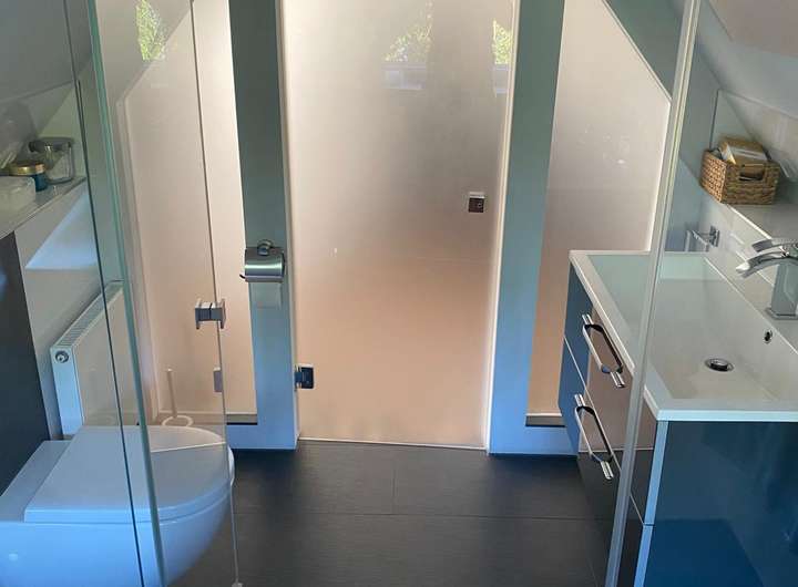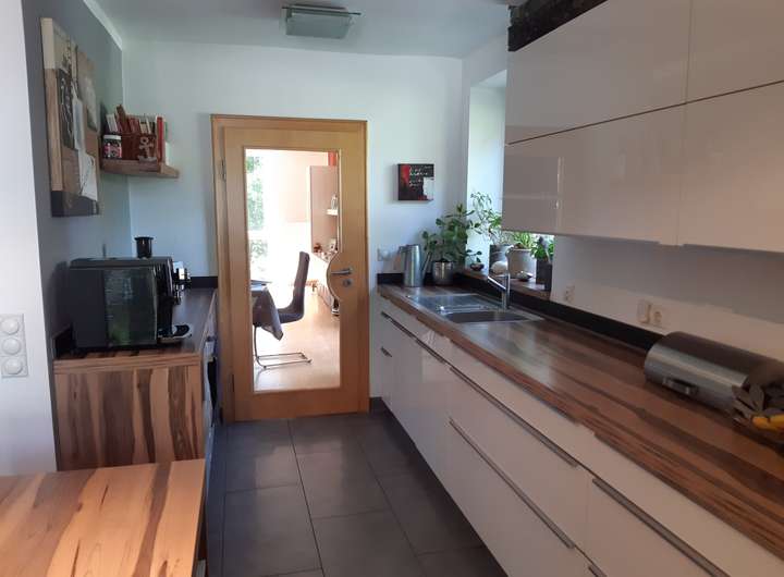 Die an das Wohnzimmer angrenzende Küche bietet neben einer hochwertigen Einbauküche mit Markengeräten auch einen schönen Eßbereich für vier Personen. Die Küchentüren mit Glaseinsatz schaffen eine lichte Atmosphäre und einen so den Wohnbereich. Ebenfalls auf dieser Etage finden Sie noch ein weiteres Zimmer, ob für Gäste oder als Büro) sowie ein kleines Duschbad.