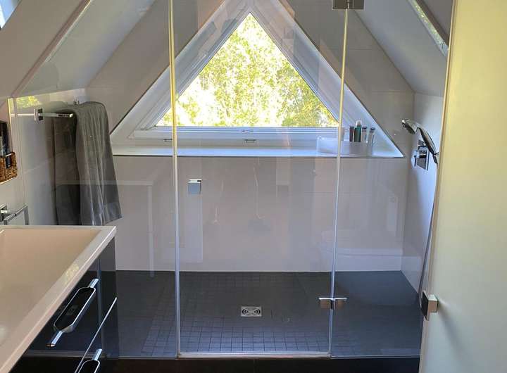 Ein weiteres Highlight des Hauses ist das Hauptschlafzimmer im obersten Stock mit einem modernen Bad en Suite. Hier blicken Sie vom Bett aus durch die bodentiefen Fenster direkt in die Baumwipfel.