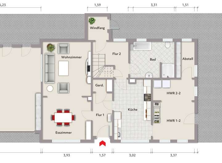 EG: Wohn-/Esszimmer, Küche, Bad, Abstellraum, HWR, Flur; Werkstatt, Garage