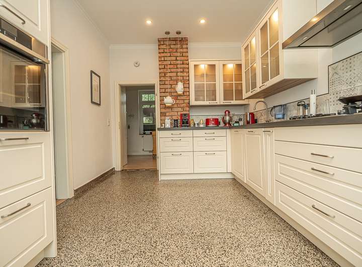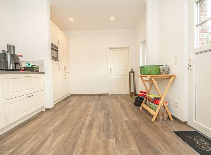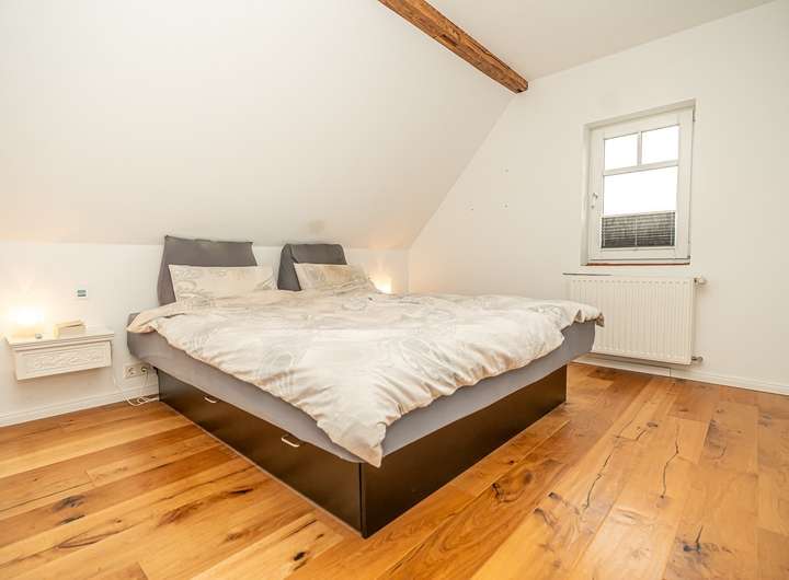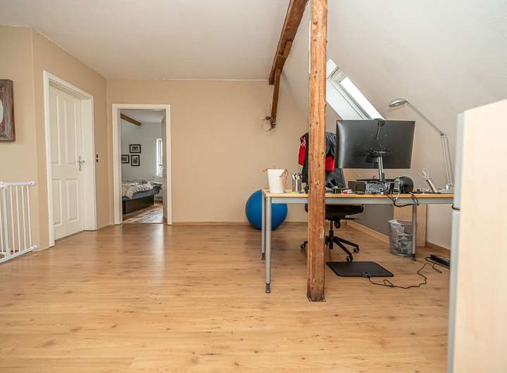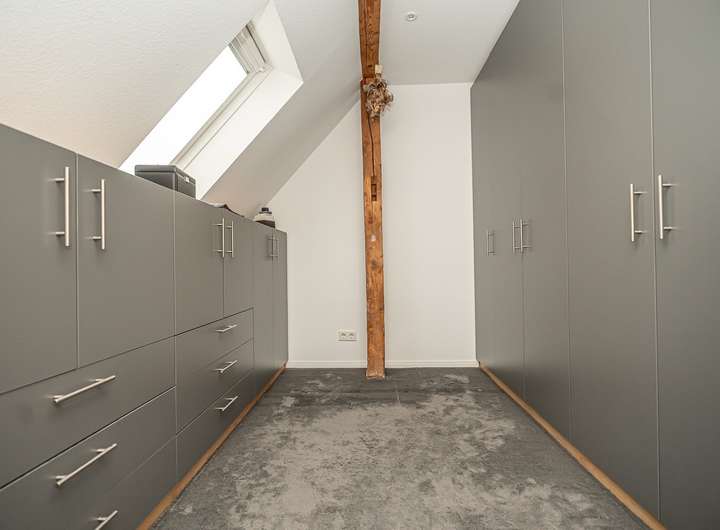 Weiterhin gibt es neben dem großen Wohnzimmerbereich im Erdgeschoss den offenen und freundlichen Küchenbereich, welcher direkt an den praktischen Hauswirtschaftsraum mit Abstellraum anschließt. Die hochwertige Einbauküche im Landhausstil ist ebenfalls im Kaufpreis enthalten. Darüber hinaus befindet sich das große Dusch- und Wannenbad inklusive gemütlicher Fußbodenerwärmung ebenfalls im unteren Bereich. Wirklich hervorzuheben ist der großzügige Galleriebereich beim Aufsteigen der Treppe zum oberen Wohnbereich. Dieser ist super lichtdurchflutet und wird derzeit als offenes Büro genutzt. Das große Schlafzimmer mit praktischem Ankleidebereich wurde 2015 saniert. Für eine optimale Raumaufteilung, vor allem für eine junge Familie, dienen noch die beiden weiteren Schlafzimmer, sowie separate Toilette. Der Spitzbodenbereich ist ebenfalls sehr geräumig und ist fast zu schade für die Nutzung als Lagerfläche.
