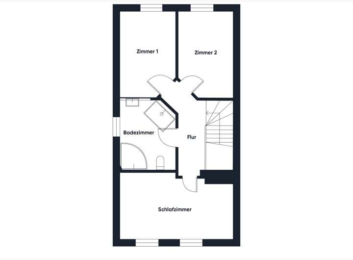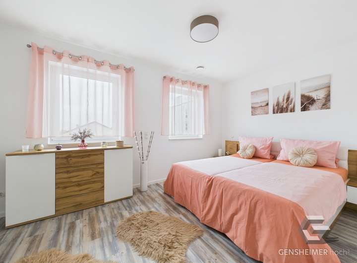 Das Obergeschoss umfasst ein geräumiges Schlafzimmer, zwei weitere Zimmer, die flexibel als Kinder-, Arbeits- oder Gästezimmer genutzt werden können, sowie ein modernes Tageslichtbad mit Dusche, Badewanne und WC.