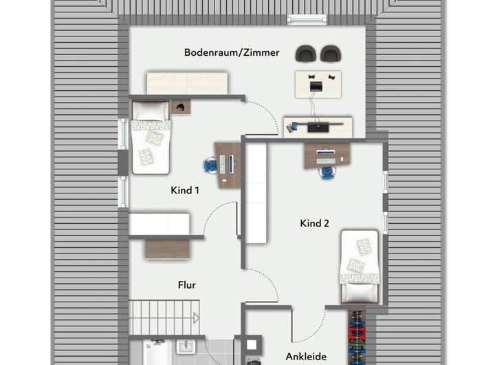 Das Dachgeschoss wurde ausgebaut und beherbergt zwei Kinderzimmer, ein separates WC sowie zwei weitere Zimmer, die flexibel genutzt werden können – beispielsweise als Büro, Gästezimmer oder Hobbyraum. Anschlüsse für eine momentan nicht vorhandene Küche liegen bereits in einem der Zimmer.