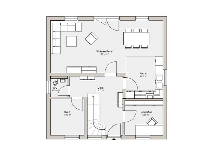 Das Erdgeschoss bietet neben großen, lichtdurchfluteten Wohn- und Essraum und der offenen Küche noch einen weiteren Raum, der beliebig, beispielsweise als Home-Office oder Gästezimmer genutzt werden kann.