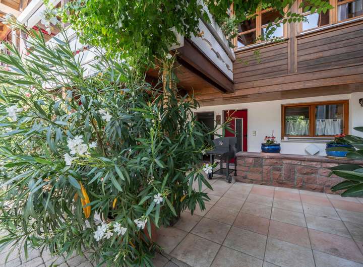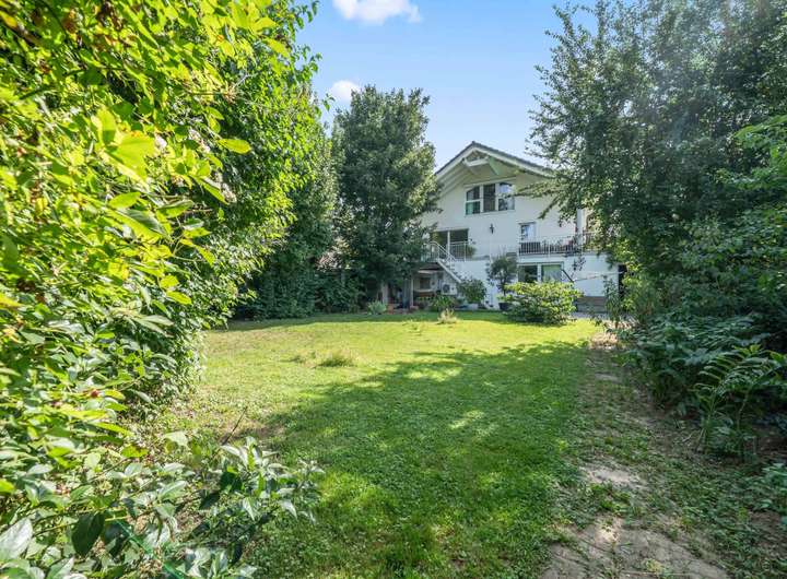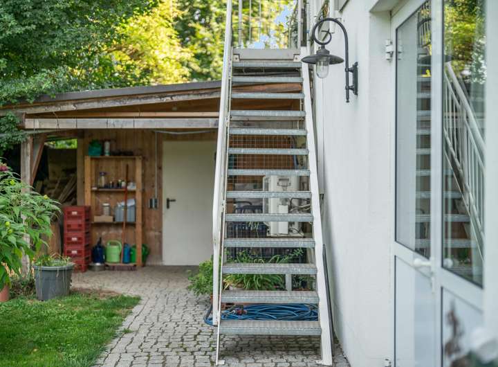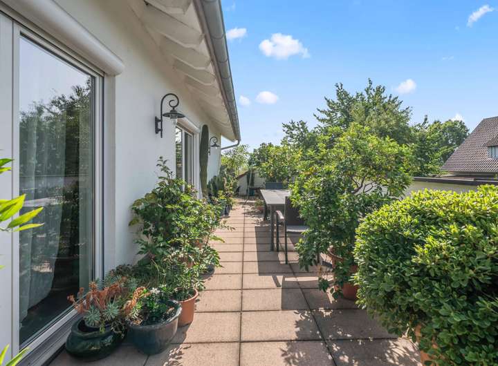 Für Gemütlichkeit sorgen der geschützte Balkon im Mitteltrakt und die umlaufende Terrasse des Neubaus, die über einen Treppenzugang in den großzügigen Garten verfügt. Hier genießt man Weitläufigkeit, Ruhe und Geborgenheit zugleich. Der Garten selbst ist eine richtige Oase und bietet mit seiner geschützten Lage Privatsphäre, gleichzeitig für Hobbygärtner die Möglichkeit zur kreativen Betätigung.