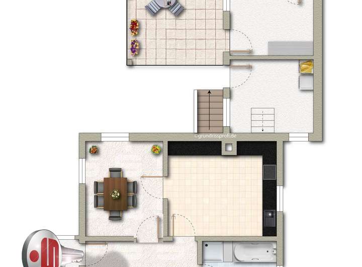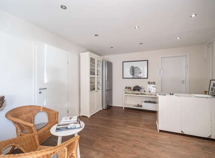 Im Zwischentrakt, der den Neubau mit dem Vorderhaus verbindet und von den Eigentümern bislang privat genutzt wird, verbinden sich funktionale Räume mit gemütlichem Wohnen: Im EG befinden sich Nebenräume und ein kleiner eigenständiger Wohnbereich, im OG schaffen das Wohnzimmer mit Küche und Essplatz der Eigentümer ein sehr großzügiges und harmonisches Gesamtbild.