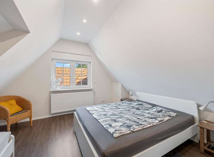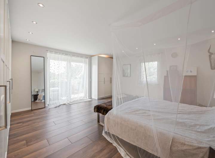 Der rückwärtige, zum Garten hin orientierte Neubau aus den 90er Jahren wurde auf den Grundmauern der ehemaligen Scheune errichtet. Hier entfaltet sich ab dem Obergeschoss ein repräsentativer Wohnbereich: helle Büro- und Schlafräume, ein Besprechungsplatz, Badezimmer und Gäste-WC sind mit dem großzügigen Wohnzimmer im Mitteltrakt verbunden. Das ausgebaute Dachgeschoss des Neubaus bietet weitere Zimmer mit eigenem Bad und schafft Rückzugsorte für Kinder, Gäste oder kreative Arbeitsbereiche.