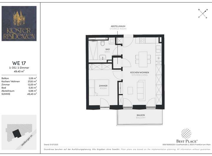 Eingebettet in die historisch wertvolle Klosteranlage Marienborn in Limburg an der Lahn bietet diese 2-Zimmer-Wohnung in den Kloster Residenzen modernen Wohnkomfort. Helle Fassaden schenken den Bewohnern tägliches Wohnglück. In den Sommermonaten wird der Balkon mit Süd-Ost-Ausrichtung zum Outdoor-Wohnzimmer. Idealerweise lässt sich die Wohnung über den Aufzug erreichen. Auch das großzügige Tageslicht-Treppenhaus bietet ein außergewöhnliches Ambiente. Hier gibt es Orte zur Begegnung. Die lichterfüllte Wohnung ist mit einem offenen Wohn-, Koch- und Essbereich modern konzipiert. Bodentiefe Fenster geben den Blick in die grüne Umgebung frei. Alles atmet Licht und Raum. Zur hochwertigen und langlebigen Ausstattung gehören Parkett, Fußbodenheizung, eine lichte Raumhöhe von ca. 2,70 m und die Vorbereitungen für eine Einbauküche. Das Komfort-Badezimmer schenkt mit bodengleicher Dusche, Design-Armaturen und Markensanitär tägliche Wellnessmomente. Zur Wohnung gehört ein Abstellabteil im Souterrain. Und für Autos stehen Außenstellplätze zur Verfügung. Hier wurde an alles gedacht, damit Sie die schönen Dinge des Lebens genießen können.