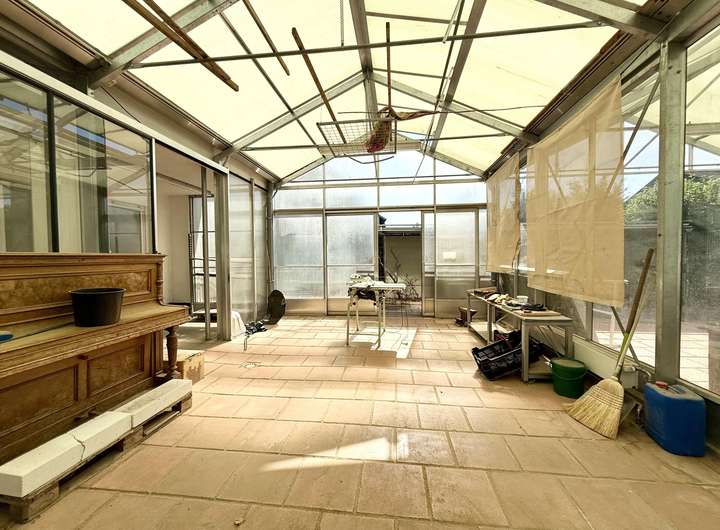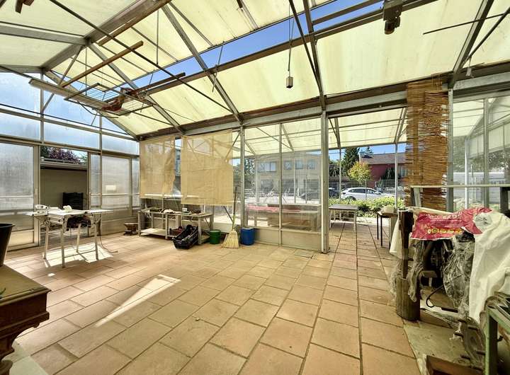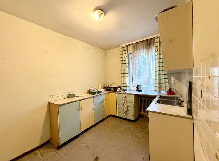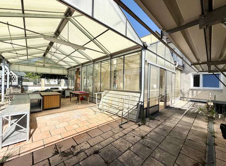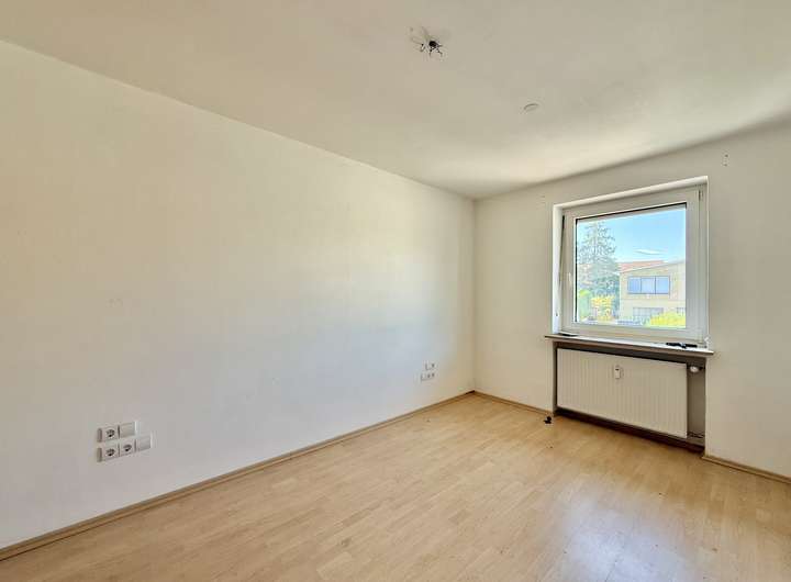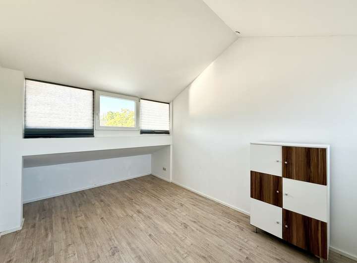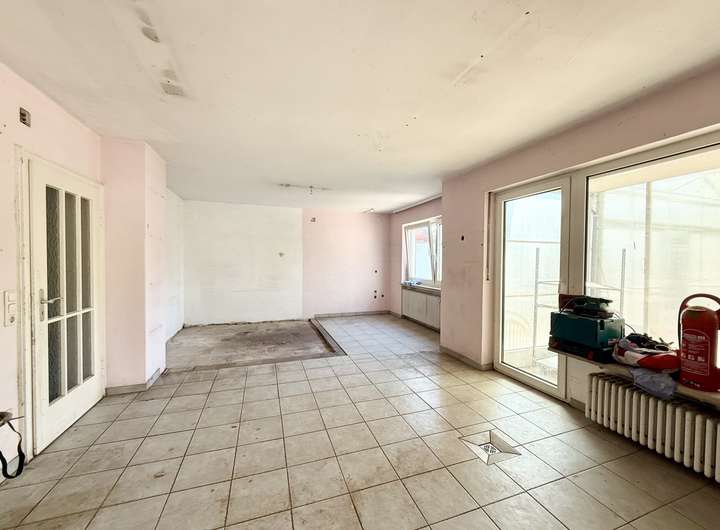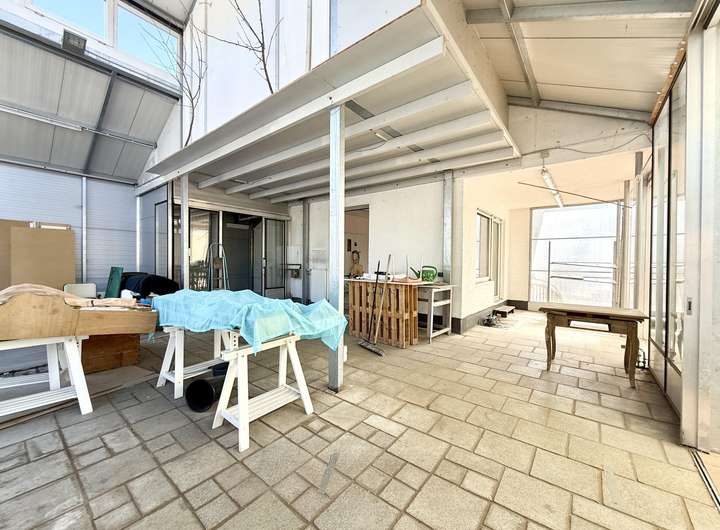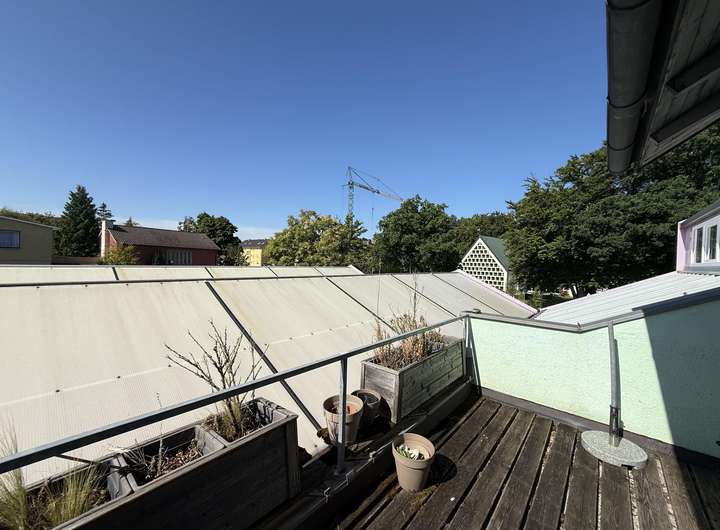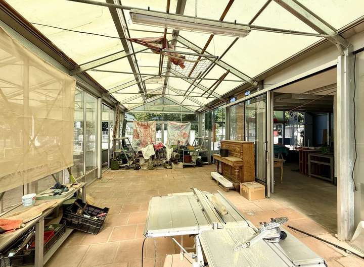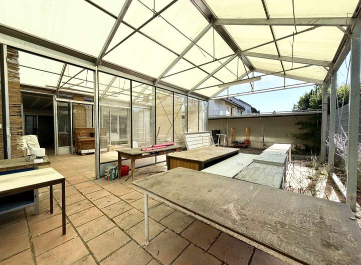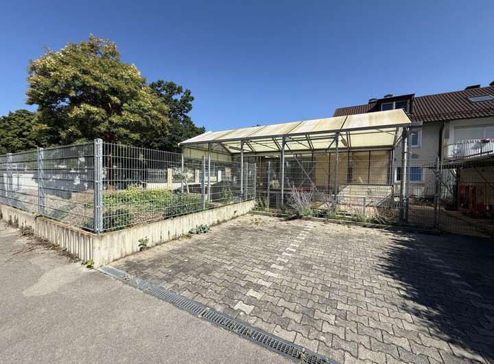 Falls der verglaste Anbau nicht genutzt wird, kann das bestehende Reiheneckhaus zur Straße hin verlängert werden. Zusätzlich kann im Grundstück ein Haus mit E+1 und Flachdach errichtet werden. Dafür gibt es eine genehmigte Bauvoranfrage.