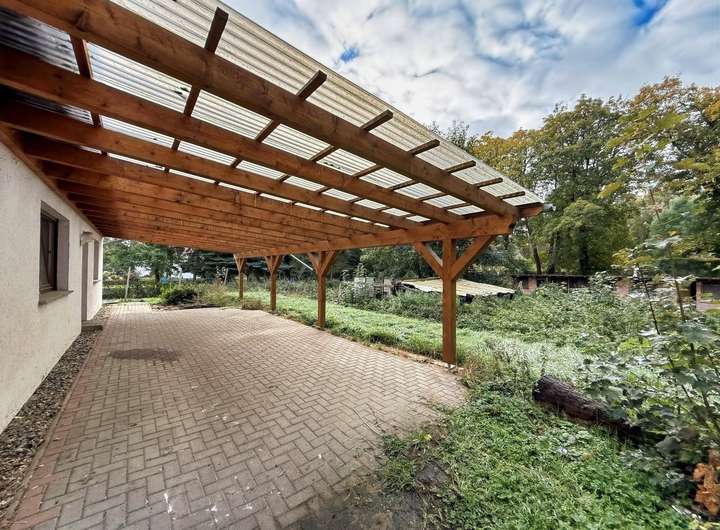 - überdachte Terrasse mit ca. 58 m², mit Blick in den weitläufigen Garten