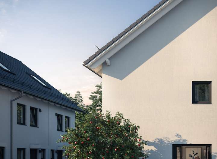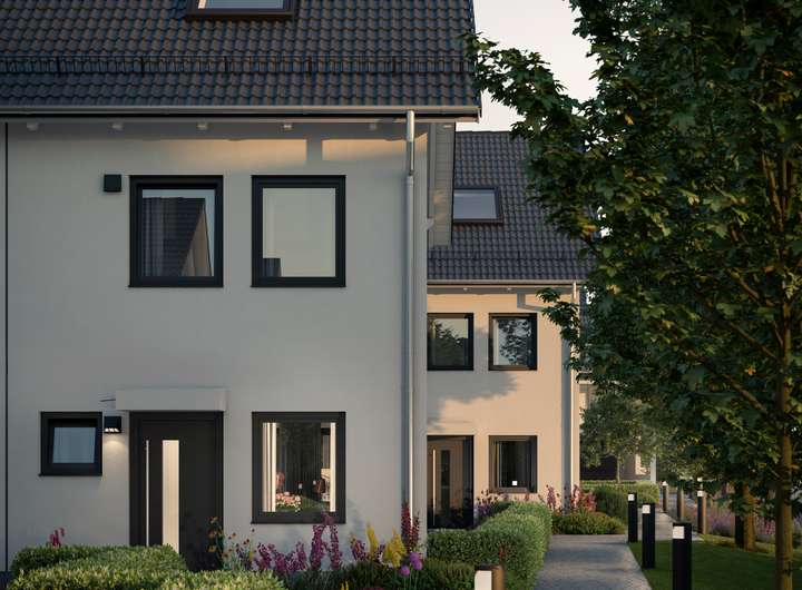 Die bereits fertiggestellten Häuser bieten ausreichend Platz für die gesamte Familie. Im Erdgeschoss befindet sich neben der Diele und einem Gäste-WC ein großzügiger Wohn-/Essbereich mit Zugang zur sonnigen Gartenterrasse. Die beiden gut geschnittenen Zimmer im 1. OG können als Schlaf- oder Arbeitszimmer genutzt werden, darüber hinaus gibt es ein Duschbad in dieser Etage. Im Dachgeschoss liegt der Masterbereich mit separatem Bad. Vervollständigt wird das gut durchdachte Wohnkonzept durch einen flexibel nutzbaren Hobbyraum im UG.