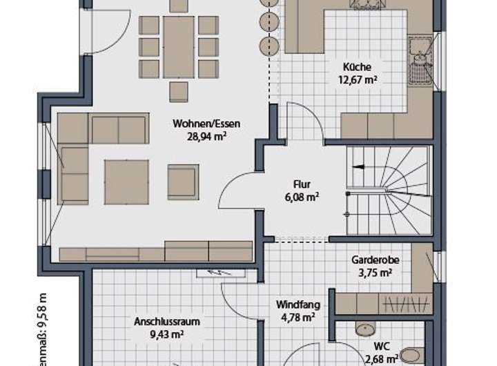 - Bodenplatte inkl. Effizienzhaus 55 Perimeter-Dämmung unterhalb der Bodenplatte sowie stirnseitig