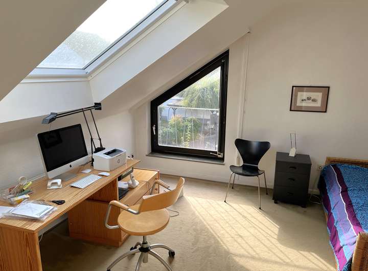 Bereits die einladende Eingangsdiele mit Garderobenbereich, die dank zweier Lichtkuppeln von Tageslicht erhellt wird, vermittelt ein angenehmes Raumgefühl. Von hier aus gelangen Sie zum Gäste-WC sowie in das helle Studiozimmer, das durch ein bodentiefes Fenster- und Türelement den Blick auf die nach Südwesten ausgerichtete Terrasse und den Garten eröffnet und direkten Zugang dorthin bietet.