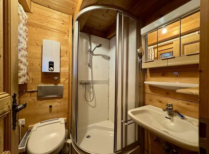 Haus 1 (Bj. 1991) verfügt über ca. 85 m² Wohnfläche in massiver Holzbauweise , mit elektrischer Fußbodenheizung und vollständigem Medienanschluss.