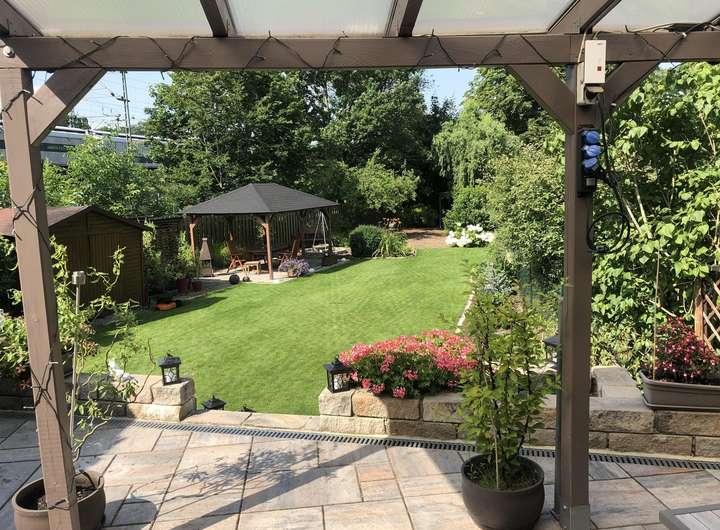 Die Grundstücksfläche beträgt ca. 614 m² (Erbpacht) und hinter dem Haus befindet sich ein idylischer Garten mit Sonnenterrasse, Grillpavillion und 2 Gartenhäusern. Der ideale Ort zum Relaxen oder für gesellige Grillabende mit Freunden.