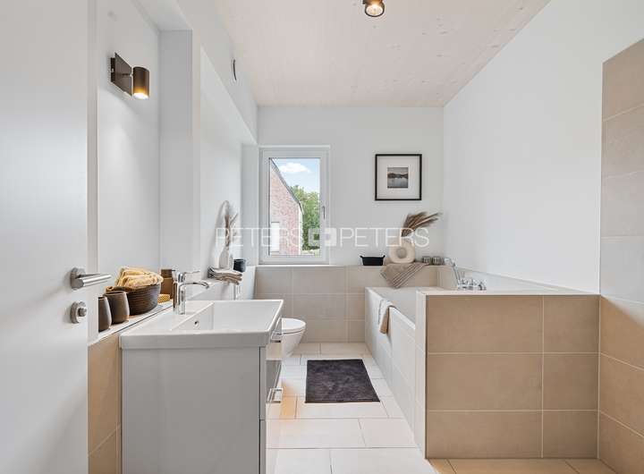Auch die Technik überzeugt: Im Erdgeschoss sorgen elektrische Rollos für Komfort, im Dachgeschoss Sonnenschutzrollos für ein angenehmes Raumklima. Drei Außensteckdosen führen bis in den Garten, die verputzten Wände sind bereits inklusive – ohne zusätzliche Kosten. Das Fliesenbudget ist in der Bauleistungsbeschreibung festgelegt, sodass sich jedes Detail individuell aussuchen lässt. Auf dem Dach: langlebige Tondachziegel sowie eine leistungsstarke Photovoltaikanlage mit 8,0 kW Peak.