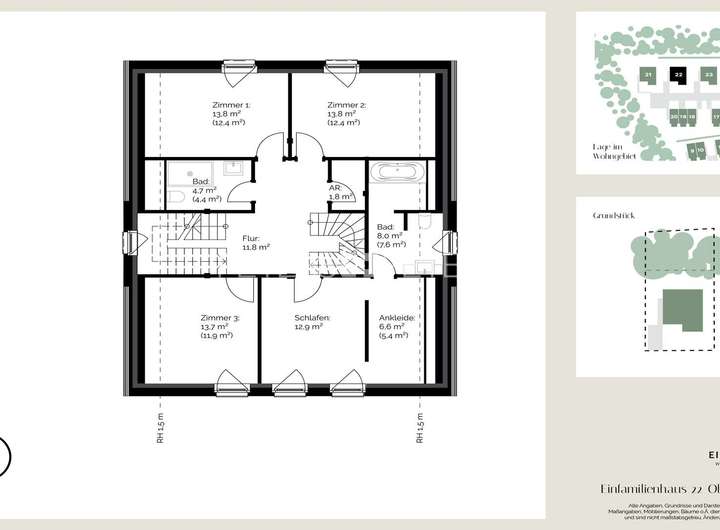 Die Planung und Grundrisse sind Beispiele für ein Haus mit ca. 187 m² Wohnfläche. Dabei kann die Größe je nach Wunsch flexibel zwischen ca. 130 und ca. 220 m² variiert und individuell an Ihre Bedürfnisse angepasst werden.